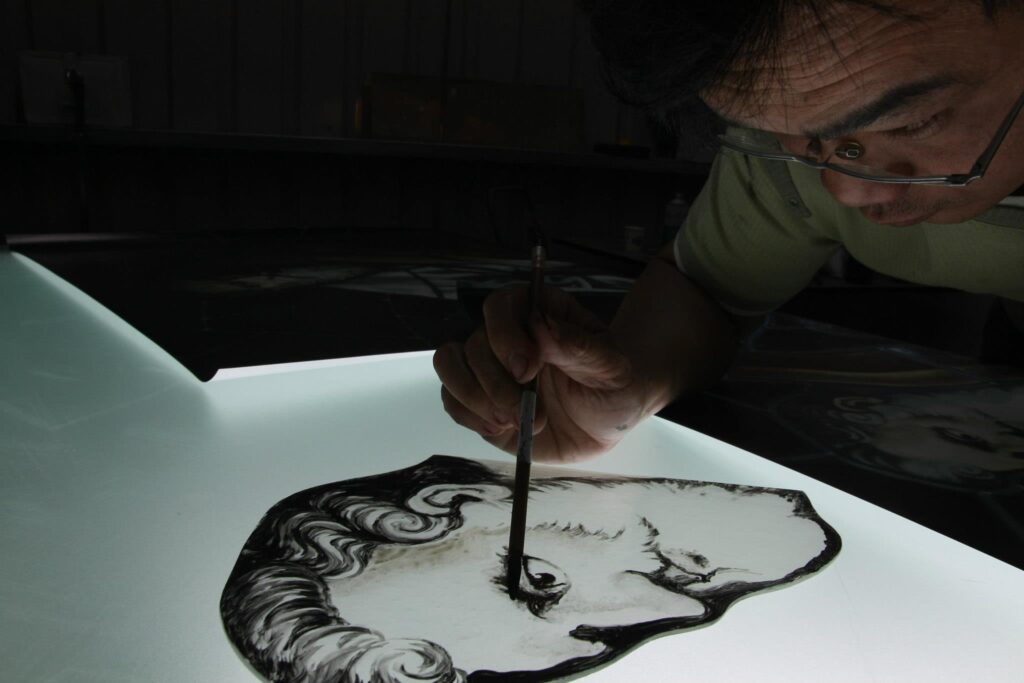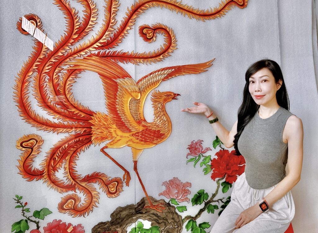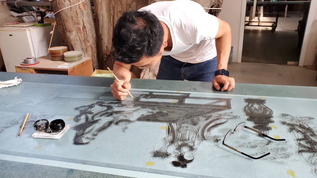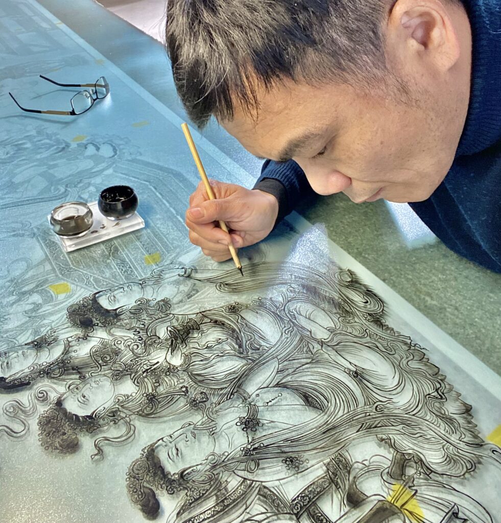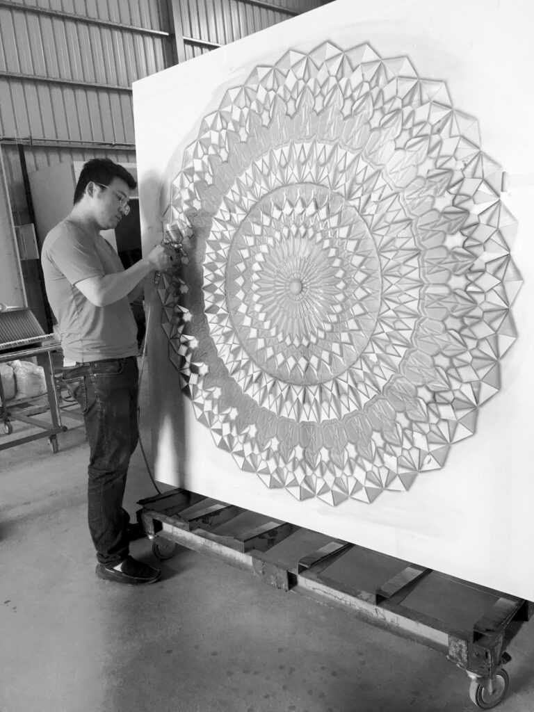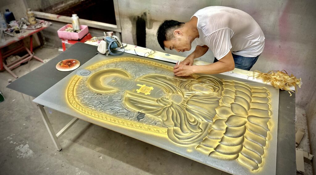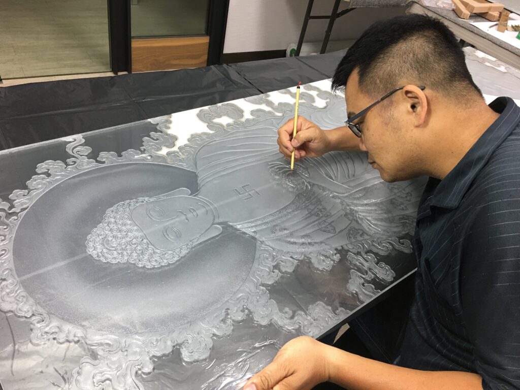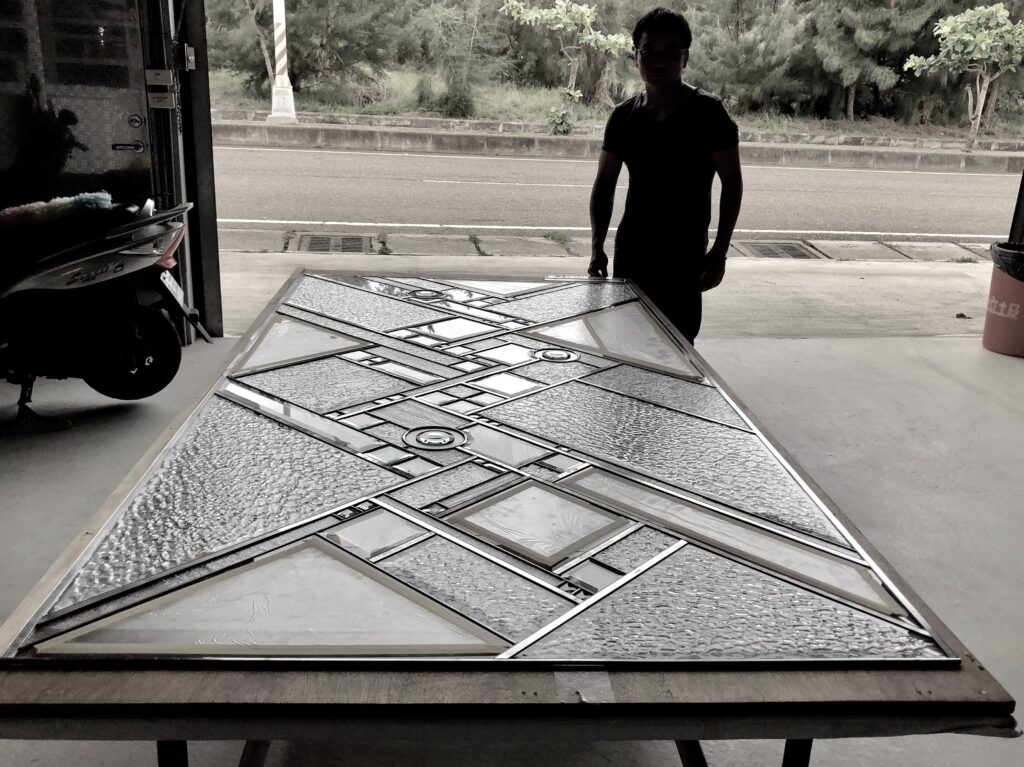 職人楊先生三十二年前接觸藝術玻璃時,正好是設計裝潢普遍使用藝術玻璃的黃金年代,那時室內設計較偏向帶有裝飾性的風格,家裡有山水綿延,松柏常青,鯉魚荷花,牡丹富貴,竹林飛鳥‘’‘都是很吉利的象徵。於是那個時期的楊政儐先生,每天就一直趴在玻璃桌面上畫圖『註:手工製作藝術玻璃都是直接在表面繪稿,對應尺寸都需要趴在玻璃上作業』那個時代的流行元素與工藝需求,也因此練就了楊先生手工繪圖的基礎,尤其是繪製大型圖面更是熟能生巧。國內最大的觀音菩薩背牆寬九米高五米竹林藝術玻璃,就是出自楊政儐先生之手。