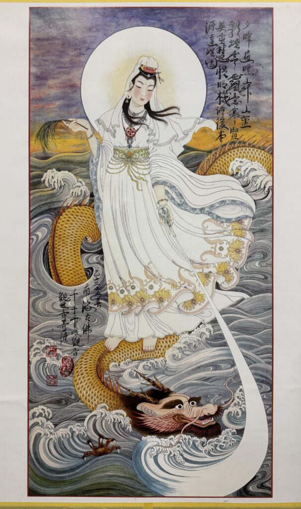 一貫天道敬奉彌勒祖師,濟公活佛,南海古佛。南海古佛即為世人所稱的觀世音菩薩,白衣大士,觀音佛祖,南海觀音,慈航道人。職人楊政儐在製作家中的觀音法相藝術玻璃的同時,也著手繪製一貫天道的南海古佛。天道的版本面積大一倍,相對細節層次也更精緻。也意味著要花更長的製作時間,職人不計工時成本一心一意就是要將南海古佛做到最殊勝,也嘗試了各種新的工法,從手工繪製圖面,描線分色定稿,手工刻圖膜線,噴砂雕刻層次,手工上色繪製描線,金屬漆逐層堆疊層次,依照各色分多次按照圖面堆疊繪製‘’‘’‘整整四個月的時間,終於完成了學藝三十二年來最頂尖的作品:南海古佛。