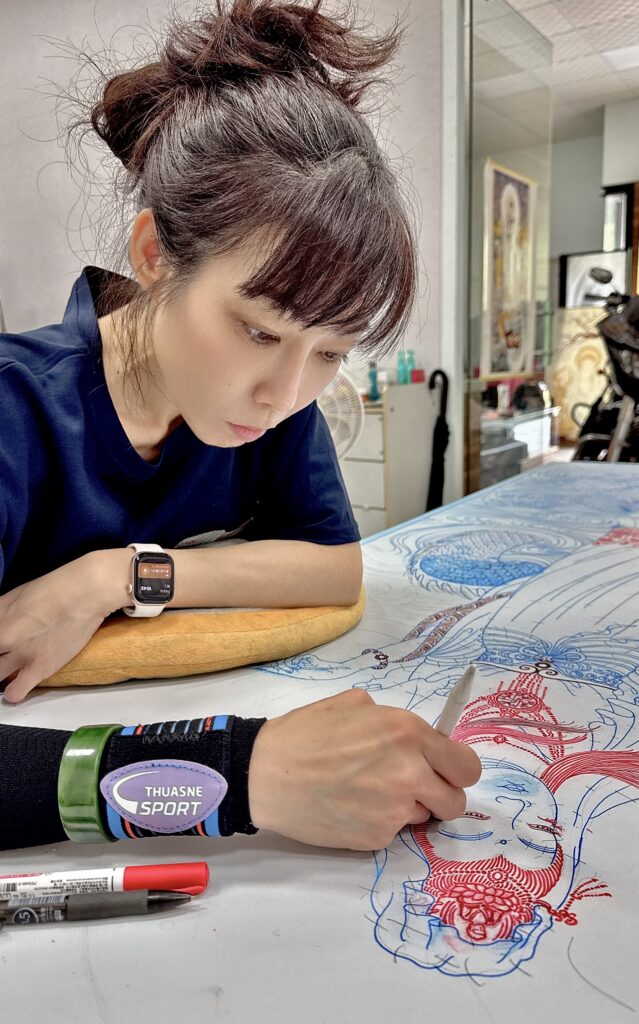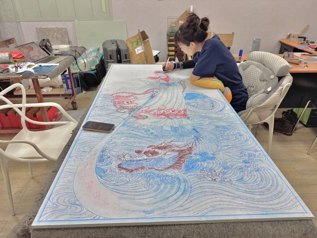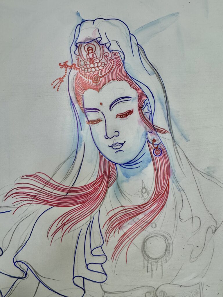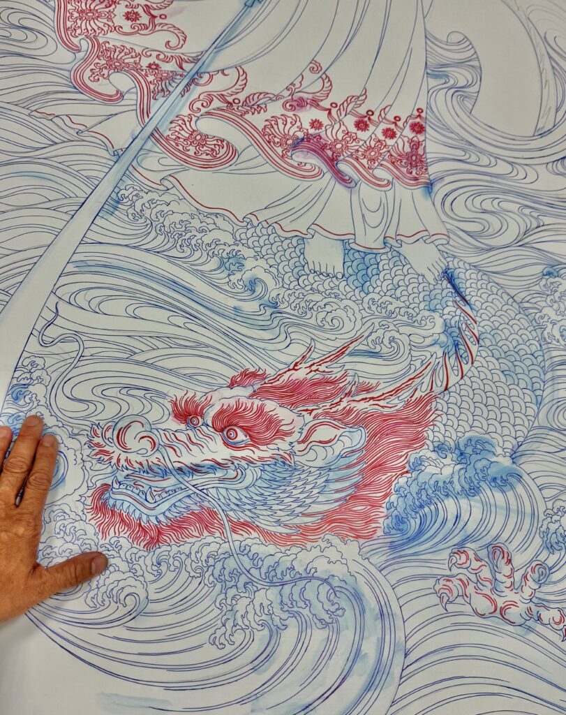 龍的眼睛位置微調遠近角度,龍爪的比例加粗放大,龍鬚更流暢飛舞更顯威武。楊政儐先生謹慎的繪製調整每一個線條位置講究每一個細節’‘’全神貫注結合心念技藝務求莊嚴仙佛。