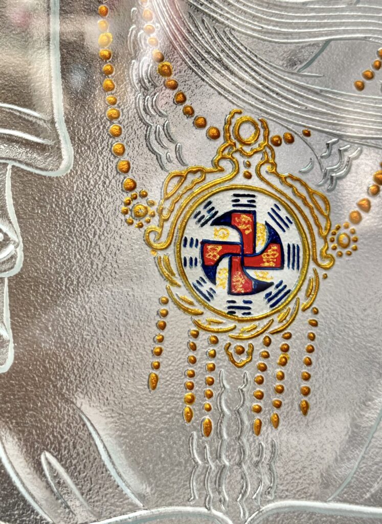 貼膜刻線遮噴再反覆貼膜刻線遮噴,一點一滴的工序累積‘’‘逐漸完成職人楊政儐先生在冥冥之中見到的古佛法相,仙佛臨壇原畫作當然是莊嚴殊勝,但受制於筆墨紙質的限制,藝術玻璃的折射能呈現不同的瑰麗光彩。