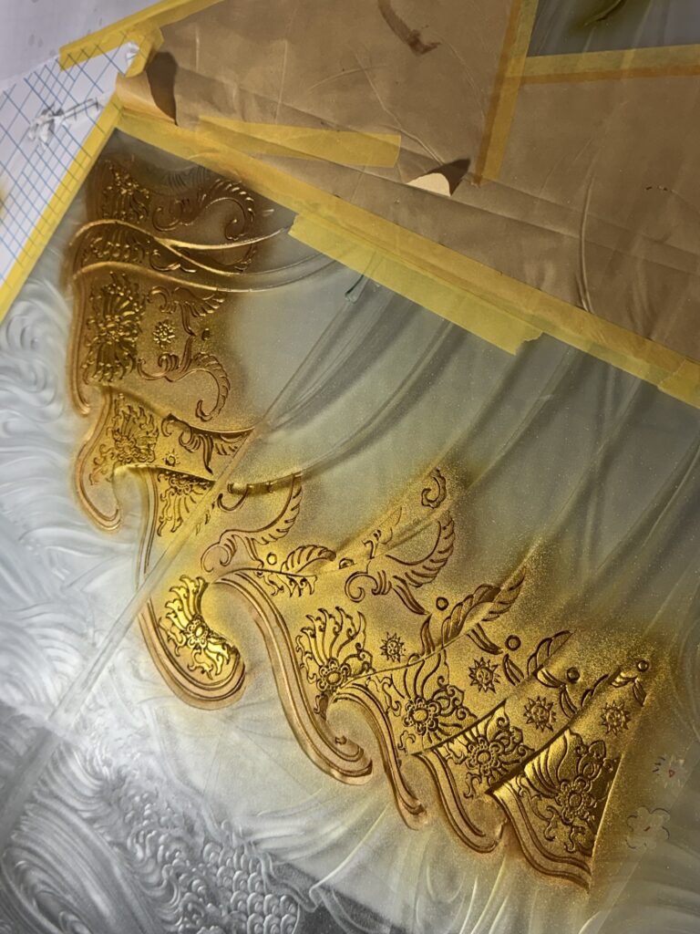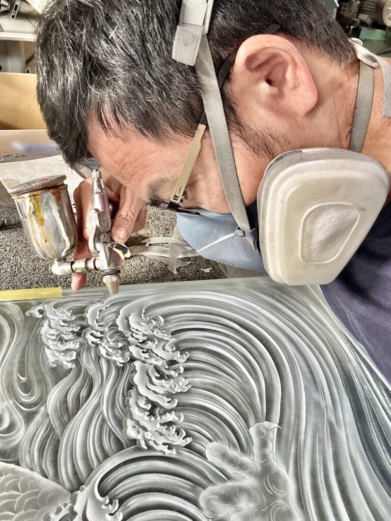 照片裡是填金屬漆的繪製過程,一般畫作與玻璃作品繪製有很大的差異,因為玻璃不像紙張會吸墨,必須薄塗待乾再薄塗反覆數次才能堆疊出豐富的層次與瑰麗的色彩。而且玻璃雕刻後是不平整的凹凸面,很考驗繪製者的手眼協調度,也幾乎沒有犯錯的空間,製程戒慎恐懼如履薄冰。