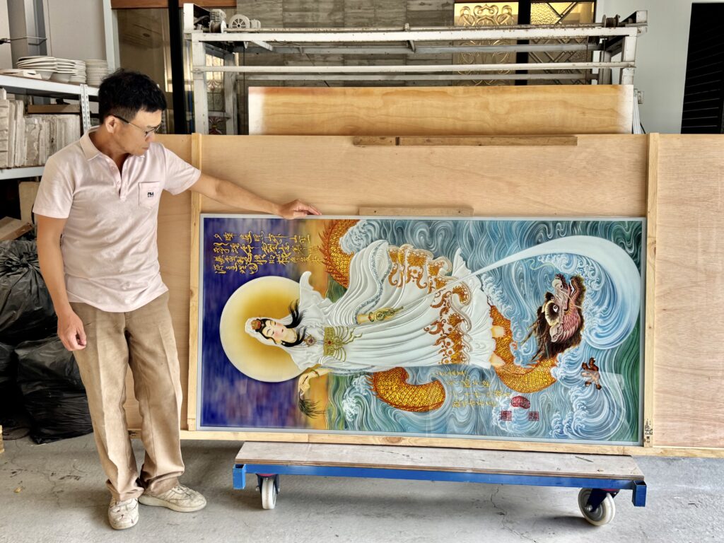 原畫作仙佛書寫的文字落印製作於藝術玻璃正面,筆畫都完整真實呈現,原本黑色的字體改成金漆更顯殊勝。龍鱗與海浪逐片遮噴層次細膩分明,色彩分際是噴色最難處理的部分,多層顏料相融時會有互相染色的狀況,楊先生深知這種顏料的物理特性,也在上一片仙佛法相製作時遇到了這樣的技術瓶頸,遇到問題就是發現答案最好的時機點。楊先生從上一次的經驗找到了顏料互染的解決方案,新工法在這片南海古佛完美展現出來。