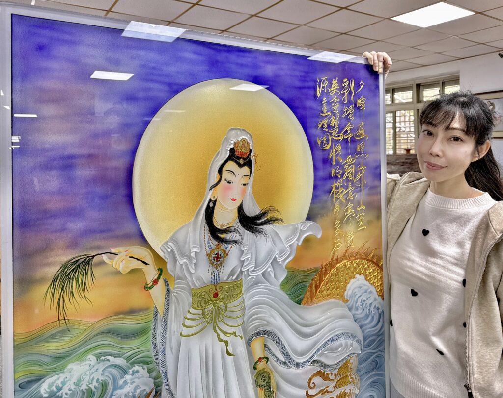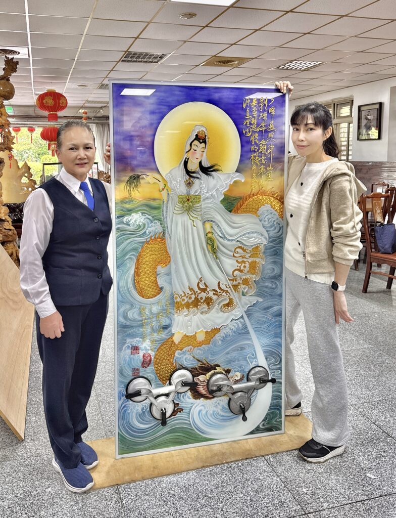 一貫天道的這副南海古佛畫像『上圖』,大約是三四十年前仙佛臨壇附身在三才畫的自畫像,是極其神聖崇高的真跡,楊先生這幾年繪製龍鳳仙鶴聖獸已相當傳神,但要繪製臨摹兼創新這副仙佛法相,用難如登天比喻亦不為過。職人楊政儐先生從苦難中悟道藝術玻璃學藝三十二年,很堅定地相信他可以辦得到。